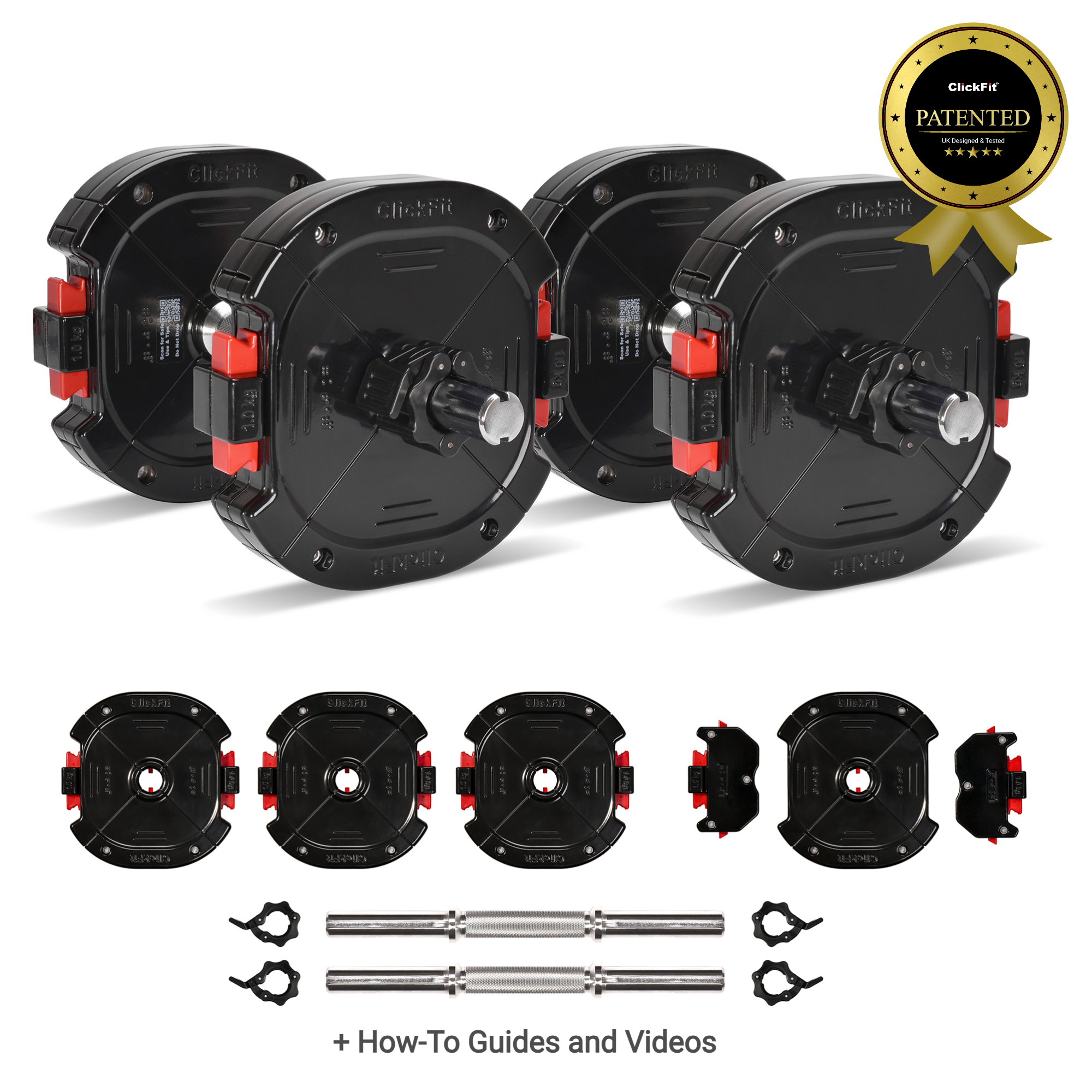 Each order comes with ClickFit’s anti-rotation dumbbell bars (x2) with knurled grips and quick release clamps.